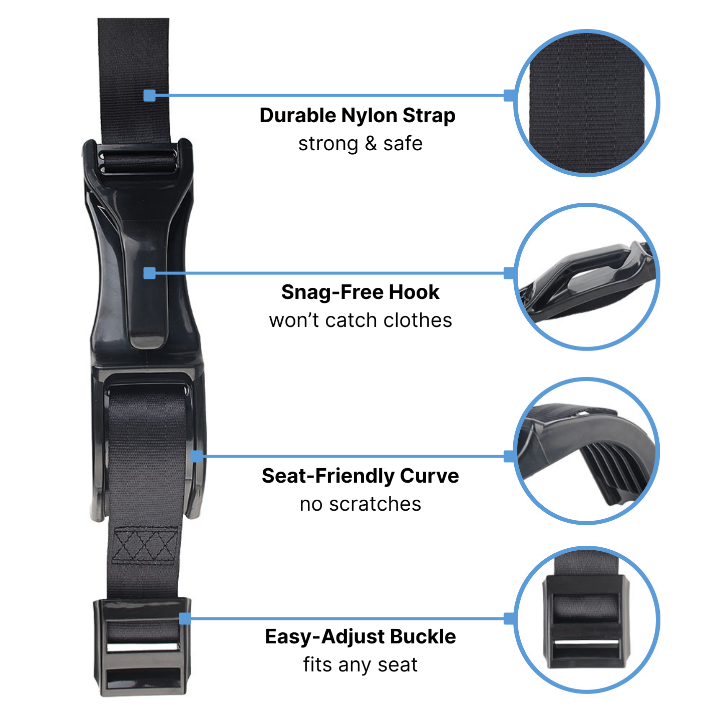 - Snag-Free Lock: Quick to secure, smooth on clothes and seats.